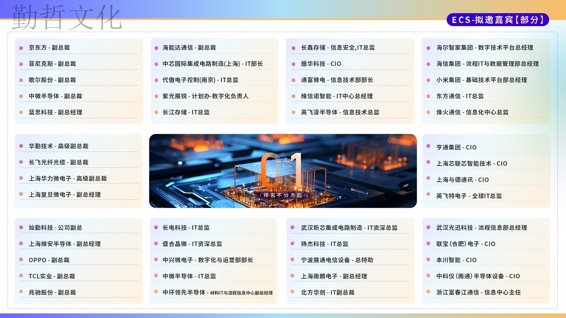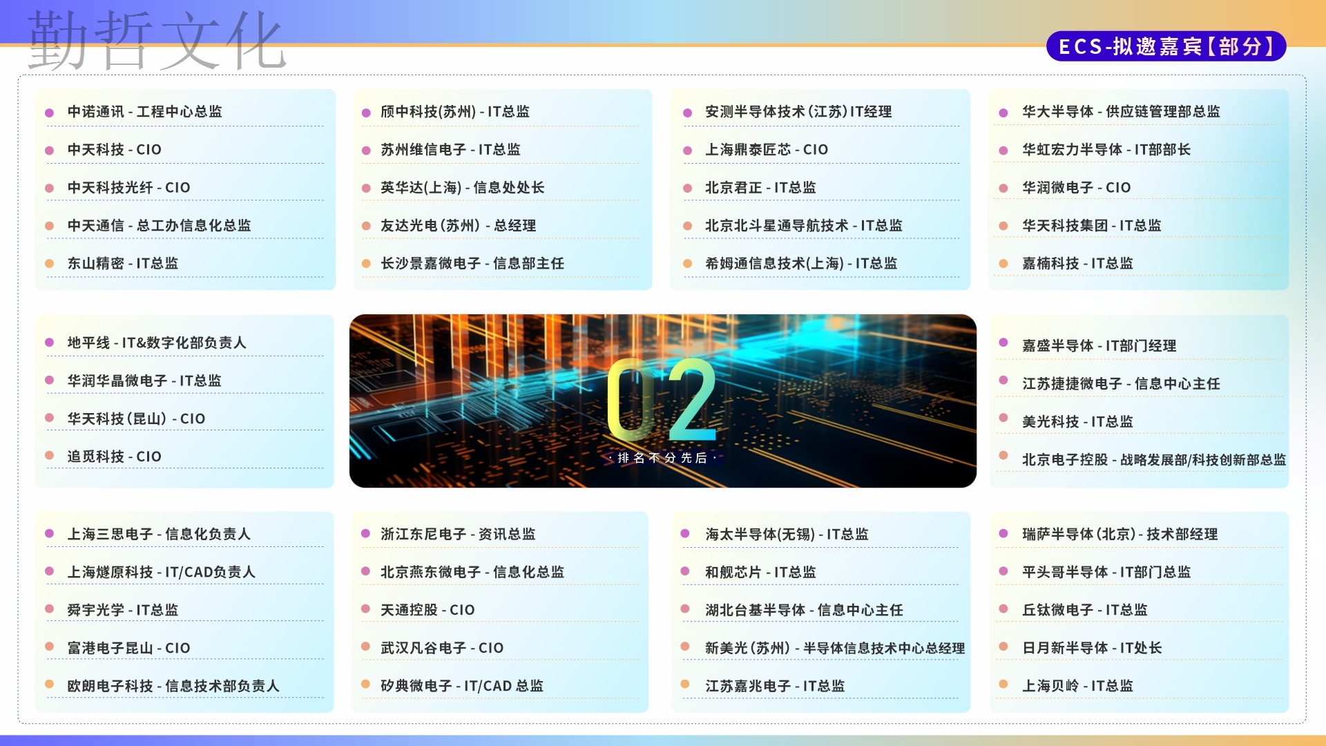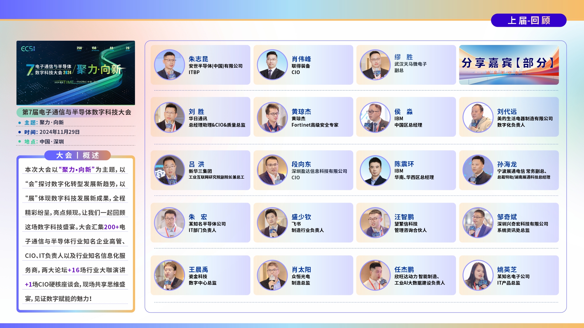 智慧交鋒、知識碰撞。本次大會匯集200+電子通信與半導體行業知名企業高管、CIO、IT負責人以及行業知名信息化服務商,兩大論壇+16場行業大咖演講+1場CIO硬核座談會……現場共享思維盛宴,見證數字賦能的魅力!