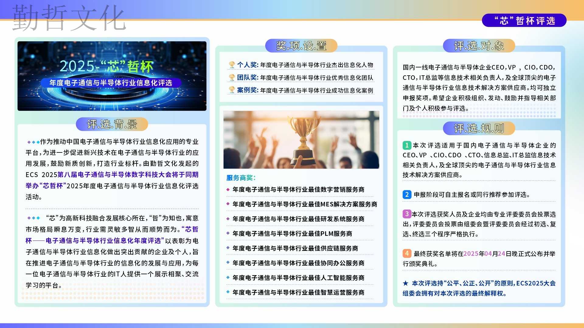 為助力電子通信與半導體行業加速創新布局,推動科技惠及全產業,由勤哲文化主辦的ECS 2025第八屆電子通信與半導體數字科技大會以“智行·創見新機”為主題,將于2025年4月24-25日在蘇州再次起航!本次大會將力邀300+電子通信與半導體行業高層決策者、數字化專家及優秀信息化服務商,聚焦AI、大數據、5G、云計算、智能制造、供應鏈、智慧研發等當下行業熱點話題,多維度為行業領袖及技術專家提供優秀案例分享及前沿技術創新的交流互鑒平臺,全面賦能電子通信與半導體行業邁向數字化轉型升級新征程!